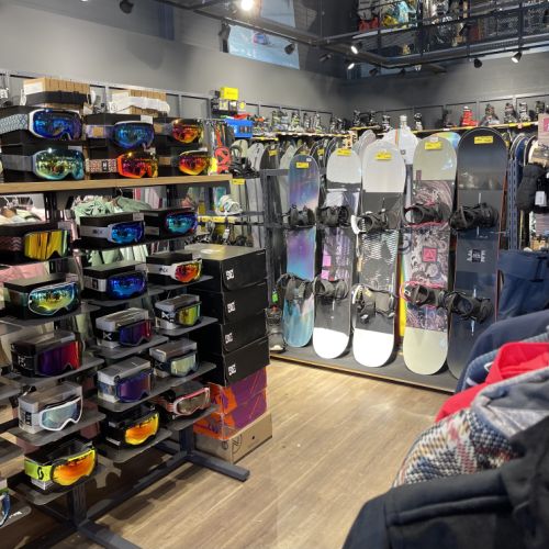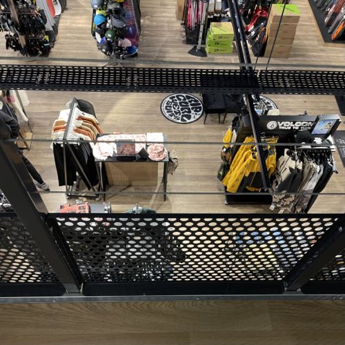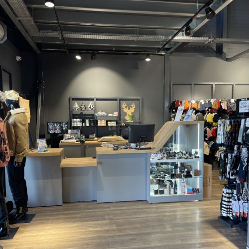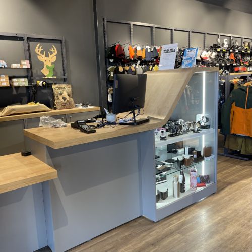 GFA a conçu cette nouvelle boutique avec des accéssoires spécifiques pour le ski,surf,Paddle,planche ,skate Board optimisation de l'espace ,cration d'un comptoir caisse original